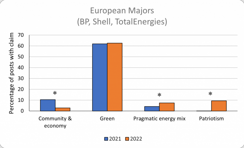 Sinds de invasie van Oekraïne posten de vijf grote oliemaatschappijen procentueel meer berichten op social media over energiezekerheid en energieonafhankelijkheid in vergelijking met dezelfde periode voor de oorlog. Het aandeel berichten waarin ze de maatschappelijke en economische voordelen van hun bedrijf benadrukten, zoals gendergelijkheid en hun hulp aan goede doelen, daalde juist. Dit blijkt uit