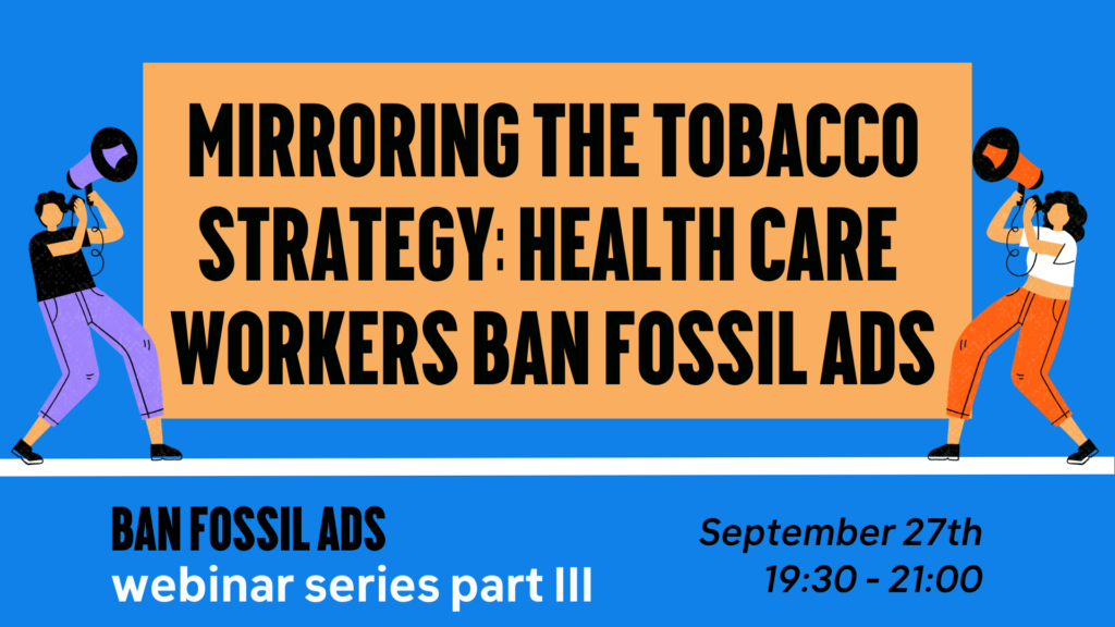We will be convening for our third Ban Fossil Ads webinar called \’Mirroring the tobacco strategy: Health care workers ban fossil ads\’. We will learn about the historical fight against tobacco advertising and draw lessons for our fight against fossil ads. Which campaigns are currently active, what are their successes and what advice do they have for groups looking to involve the health care perspective? How can we ban fossil ads on a local scale, but also how can we put pressure collectively on international bodies like the WHO to make a global fossil ad ban a reality?